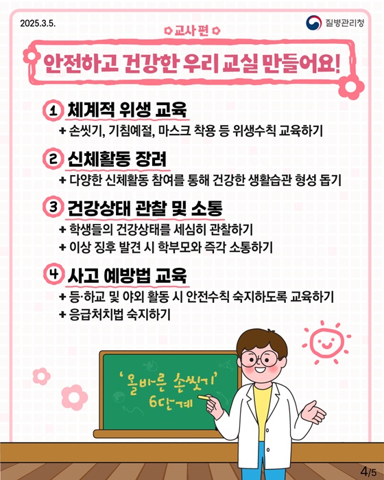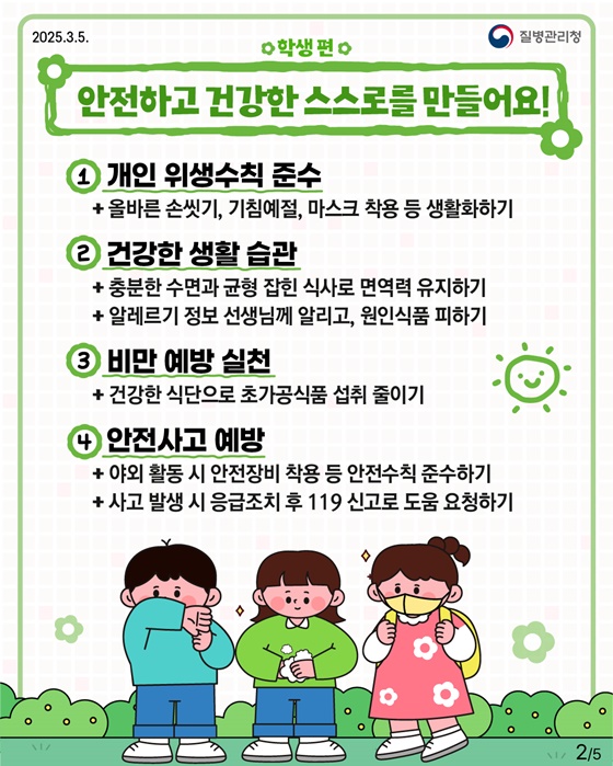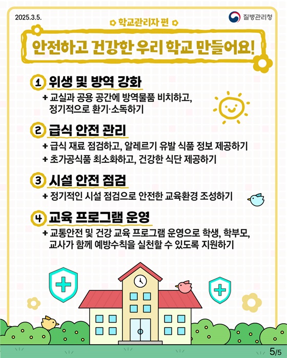 새 학기는 건강한 몸과 마음으로 시작하는 것이 중요합니다. 학생, 학부모, 교사 및 학교 관리자 모두가 함께 협력하여 안전하고 건강한 학교 환경을 조성해야 하며, 이를 위한 다양한 정책과 예방 조치를 지속적으로 시행해야 합니다.